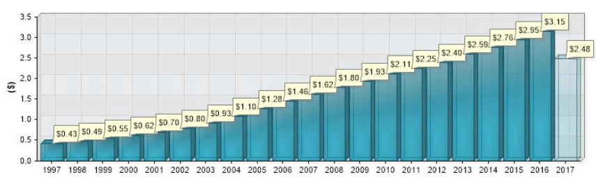 As an example, Johnson & Johnson’s (JNJ) dividend history over the last 20 years is shown below: