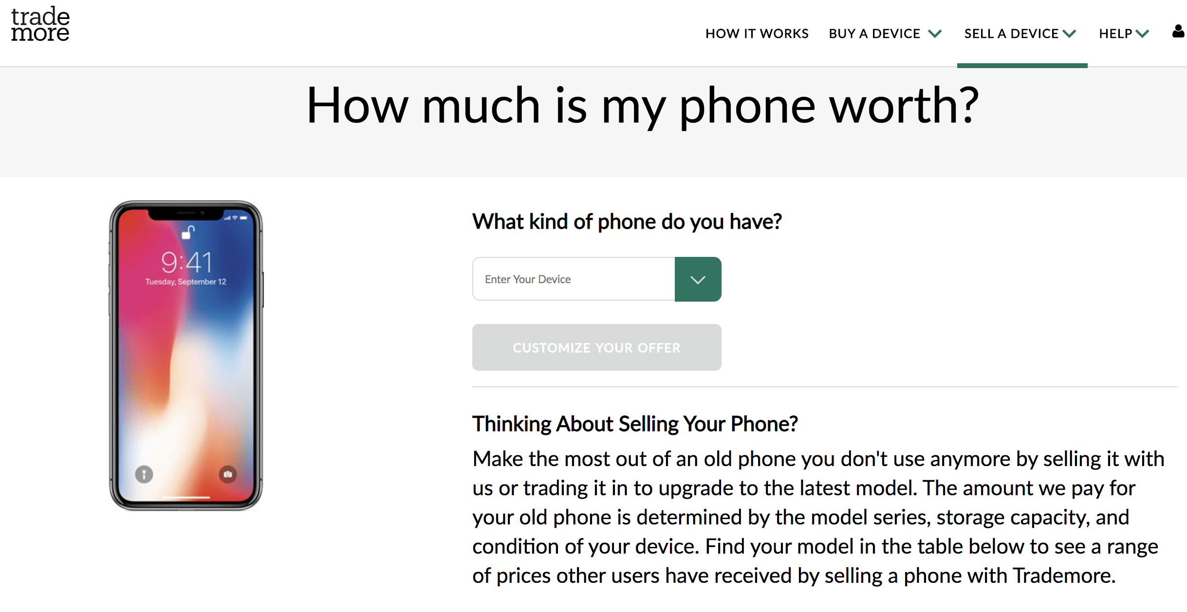 1. Visit Trademore’s How Much Is My Phone Worth? page to quickly find out how much you can get for trading in your phone. You can sell your iPhone, smartphone, tablet, and smartwatches on their website and receive a competitive price.