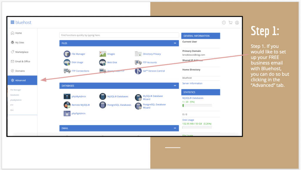 If you would like to set up your free custom blog email with Bluehost, you can do so by first logging into your Bluehost cPanel, and then clicking on the “Advanced” tab.