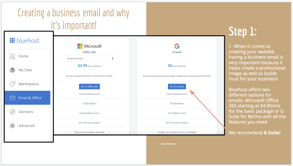 Setting up your paid business email address in your Bluehost dashboard with GSuite!
