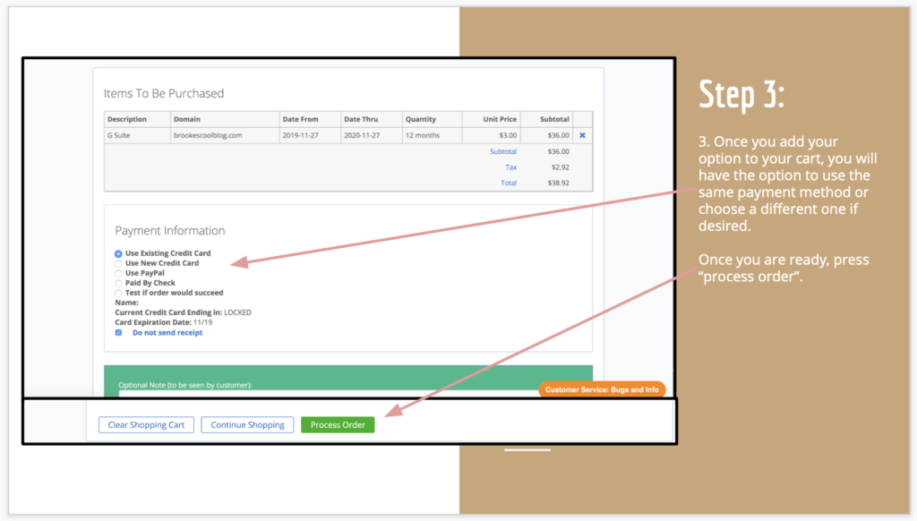 Once you add your option to your cart, you will have the option to use the same payment method or choose a different one if desired. Once you are ready, press “process order”.