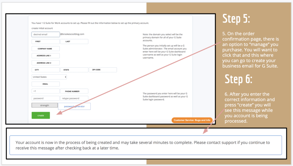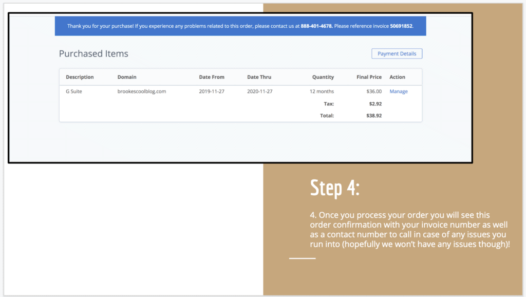 On the order confirmation page, there is an option to “manage” you purchase. You will want to click that and this where you can go to create your business email for G Suite.