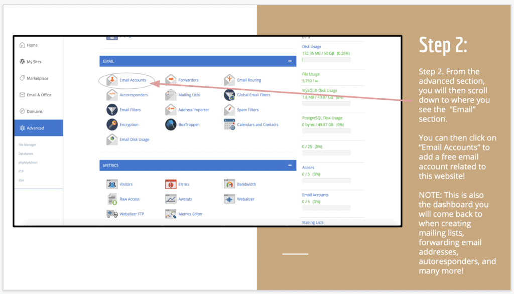 From the advanced section, you will then scroll down to where you see the “Email” section. You can then click on “Email Accounts” to add a free email account related to your website domain name.