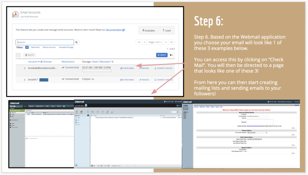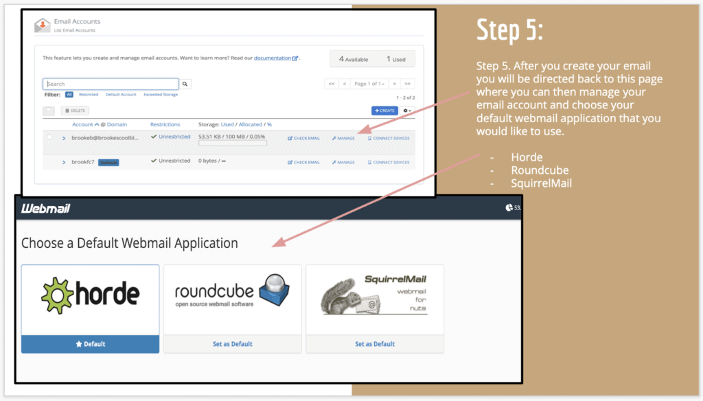 After you create your email you will be directed back to this page where you can then manage your email account and choose your default webmail application that you would like to use.