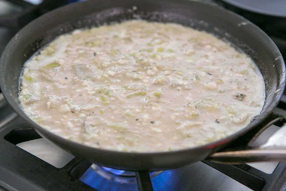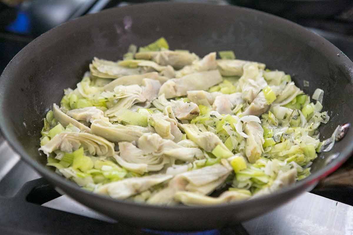 Once the leeks are cooked through and softened, add the artichoke hearts, tarragon, and salt. Cook until the artichoke hearts are warmed through, then remove from pan to a bowl and set aside.