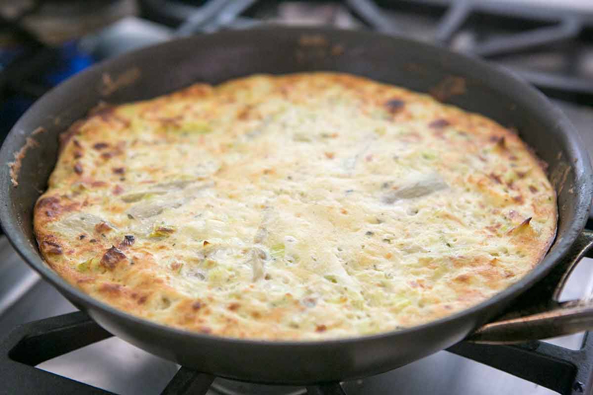 Here's a fritta perfect for spring, with fresh chopped leeks and artichoke hearts, Parmesan and cottage cheeses, and seasoned with tarragon. Enjoy!