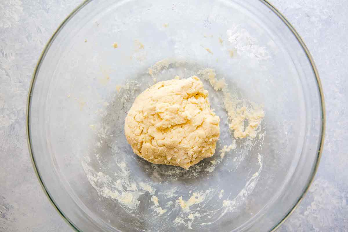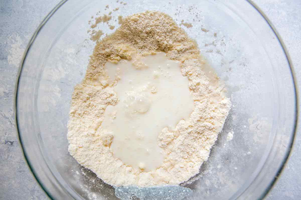 Elise Bauer Make a well in the center and add the milk. Mix together with a fork or wooden spoon just until the dough comes together. Form it into a ball. It should be rather shaggy. Do not knead or overwork it or the dumplings will be tough.
