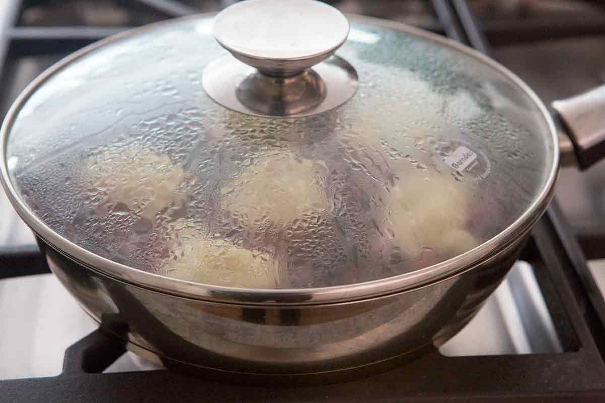 Do not uncover to peek at the dumplings while cooking! The dumplings need the steady steam and pressure from being covered to cook properly so they are light and fluffy.