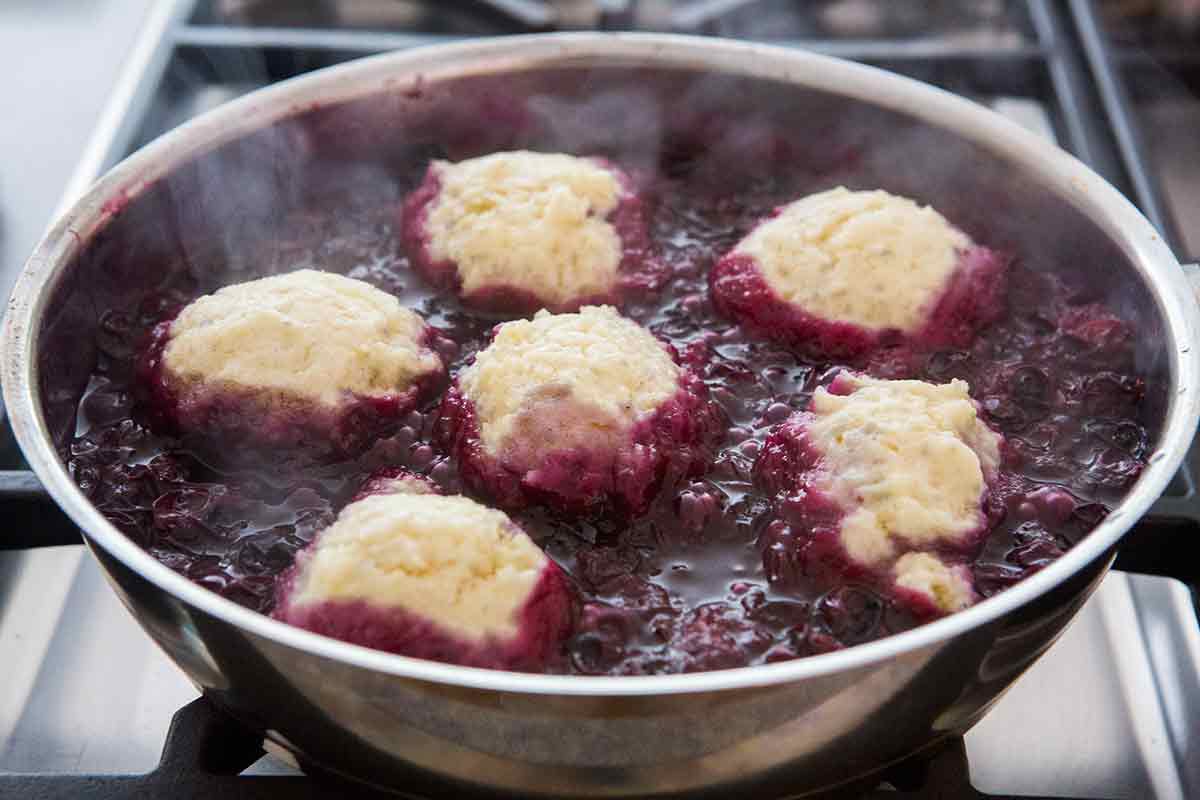 - Steamed dumplings cooked over bubbling blueberries become fluffy and tender.