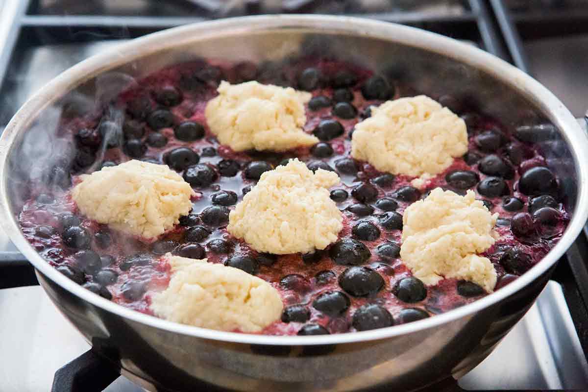 On top of that hot blueberry lava, you drop dumpling batter and cover the pot. The steam gently cooks the dumplings to fluffy, tender, biscuity clouds. No need to brown the dumplings, they're perfect as is.
