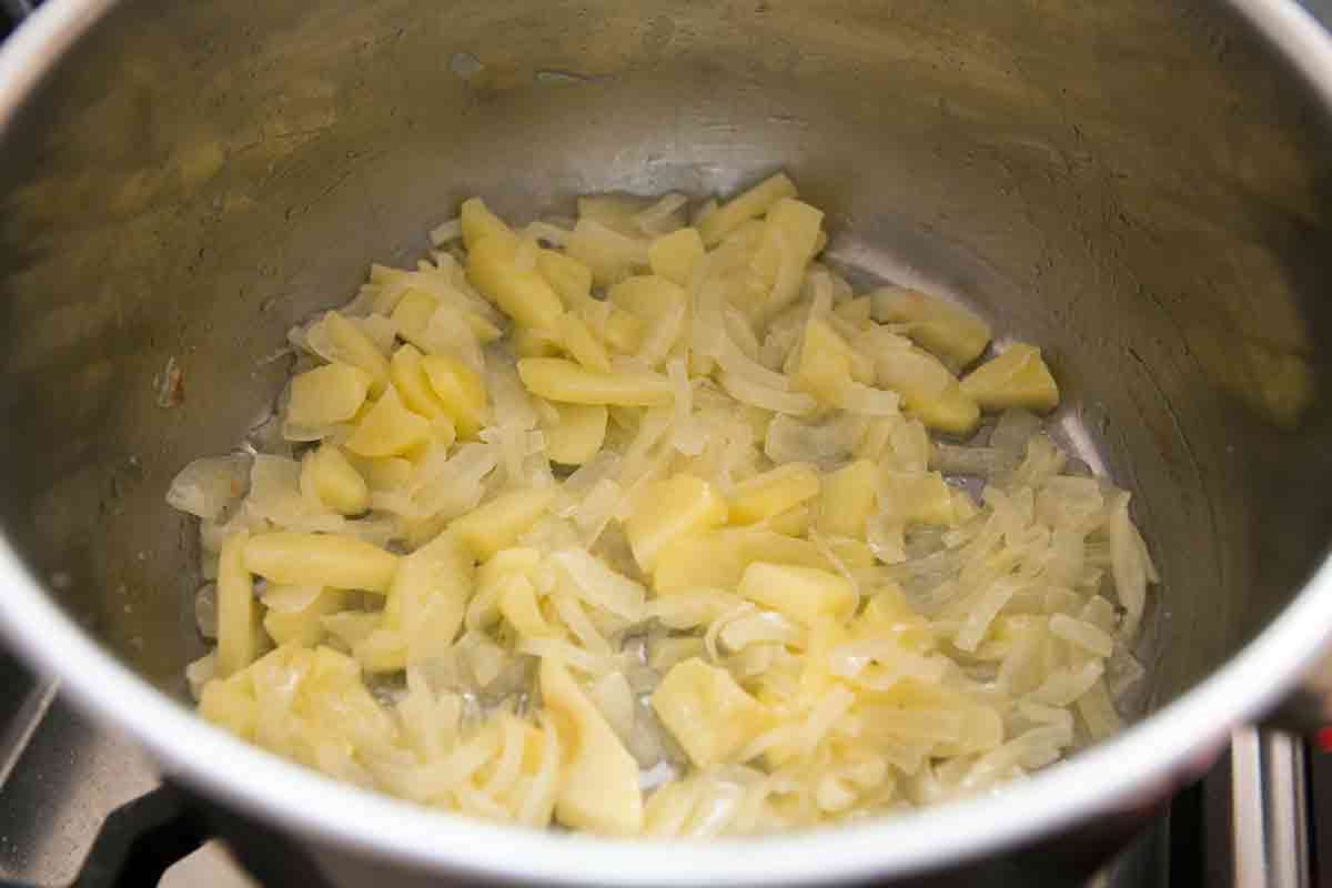 Heat a thick-bottomed medium large (4-quart) saucepan on medium heat. Melt the butter in the pan. Add the onion and the apple and lower the heat to low. Cover and cook for 10 minutes, until onions are translucent and apples are softened.