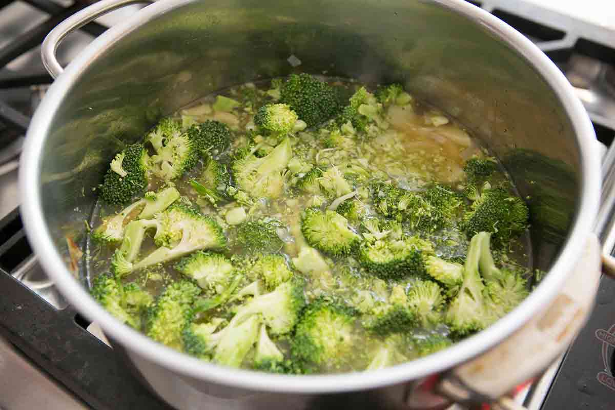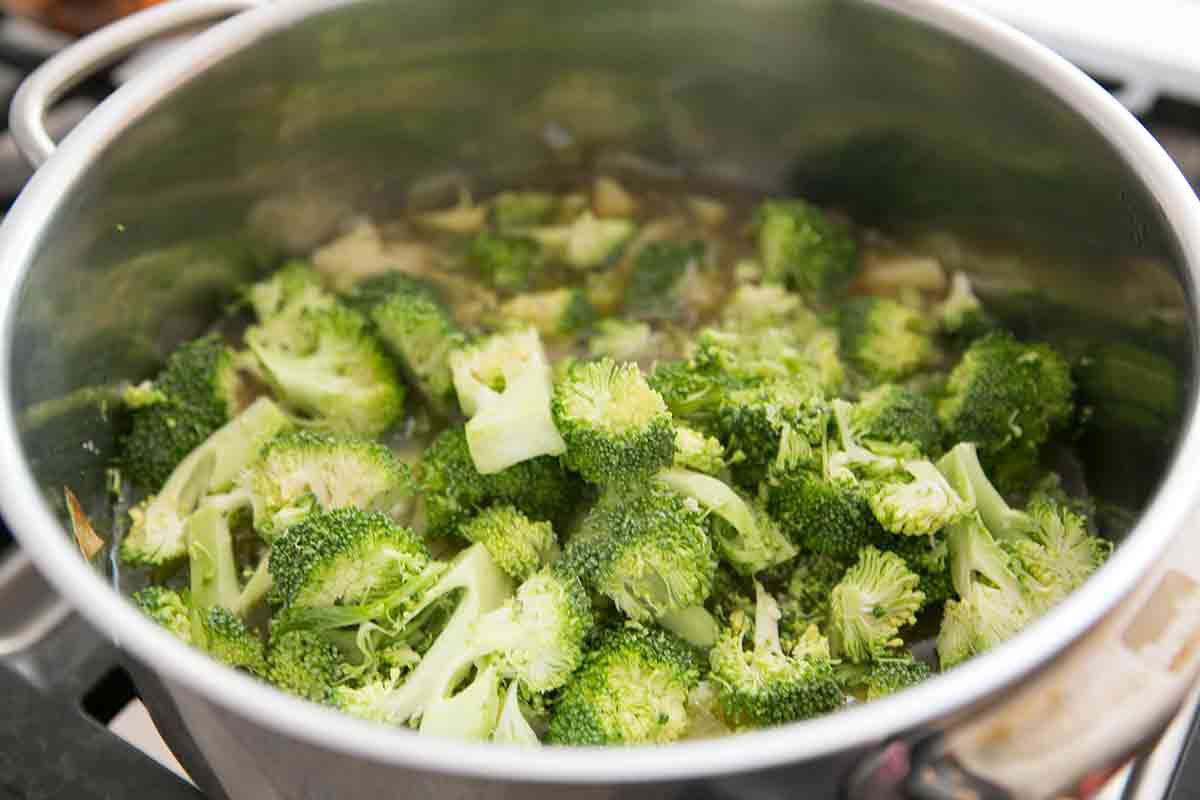 Add the broccoli, stock, cider, thyme, lemon zest: