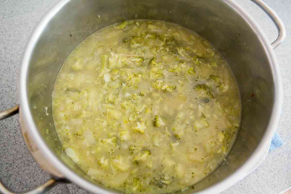 Add the broccoli florets and the chopped broccoli to the apple onion mixture. Add the stock and the cider.