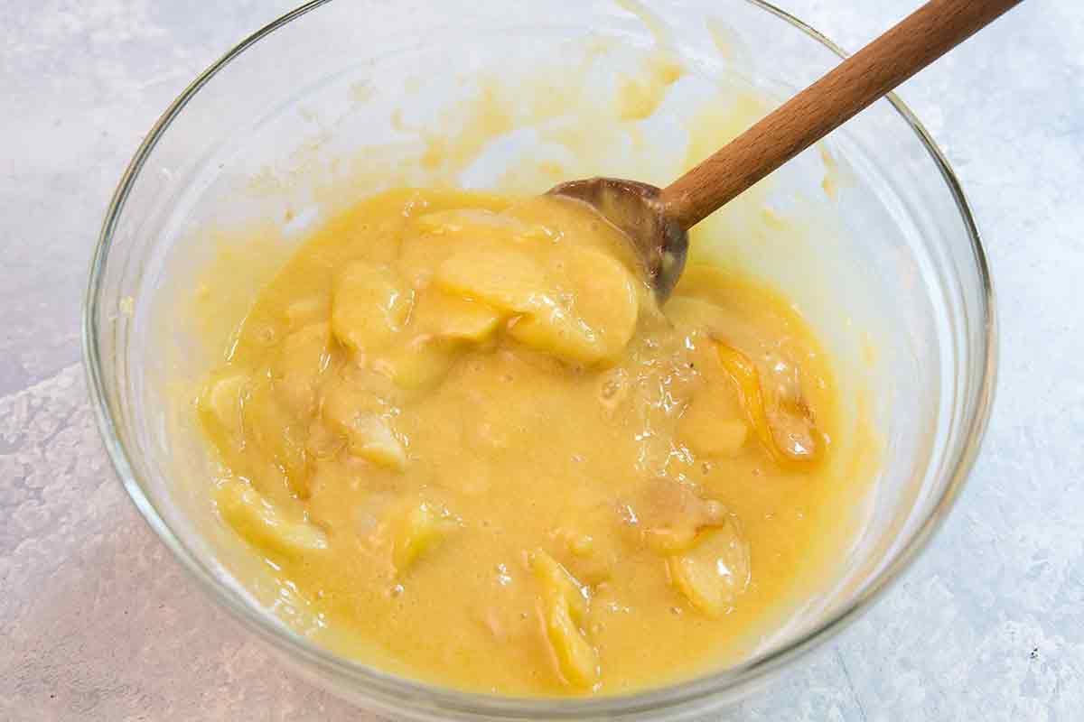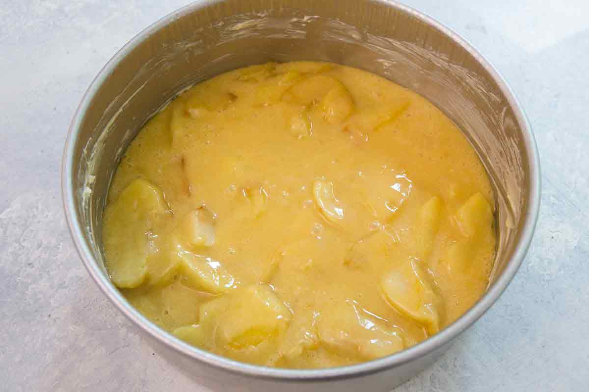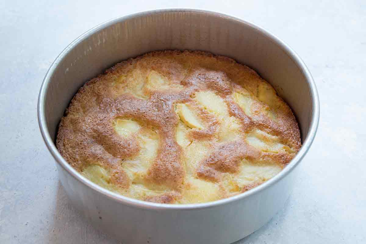The key is to first cook the apple slices in butter before adding them to the batter. Not only do the apples get infused with buttery flavor, but pre-cooking them also helps remove moisture, so the cake doesn't get soggy.