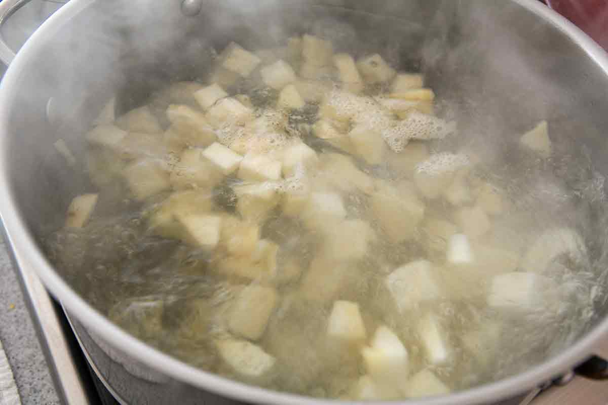 Add the cubed celery root to the boiling water and boil for 25 or 30 minutes, until soft.