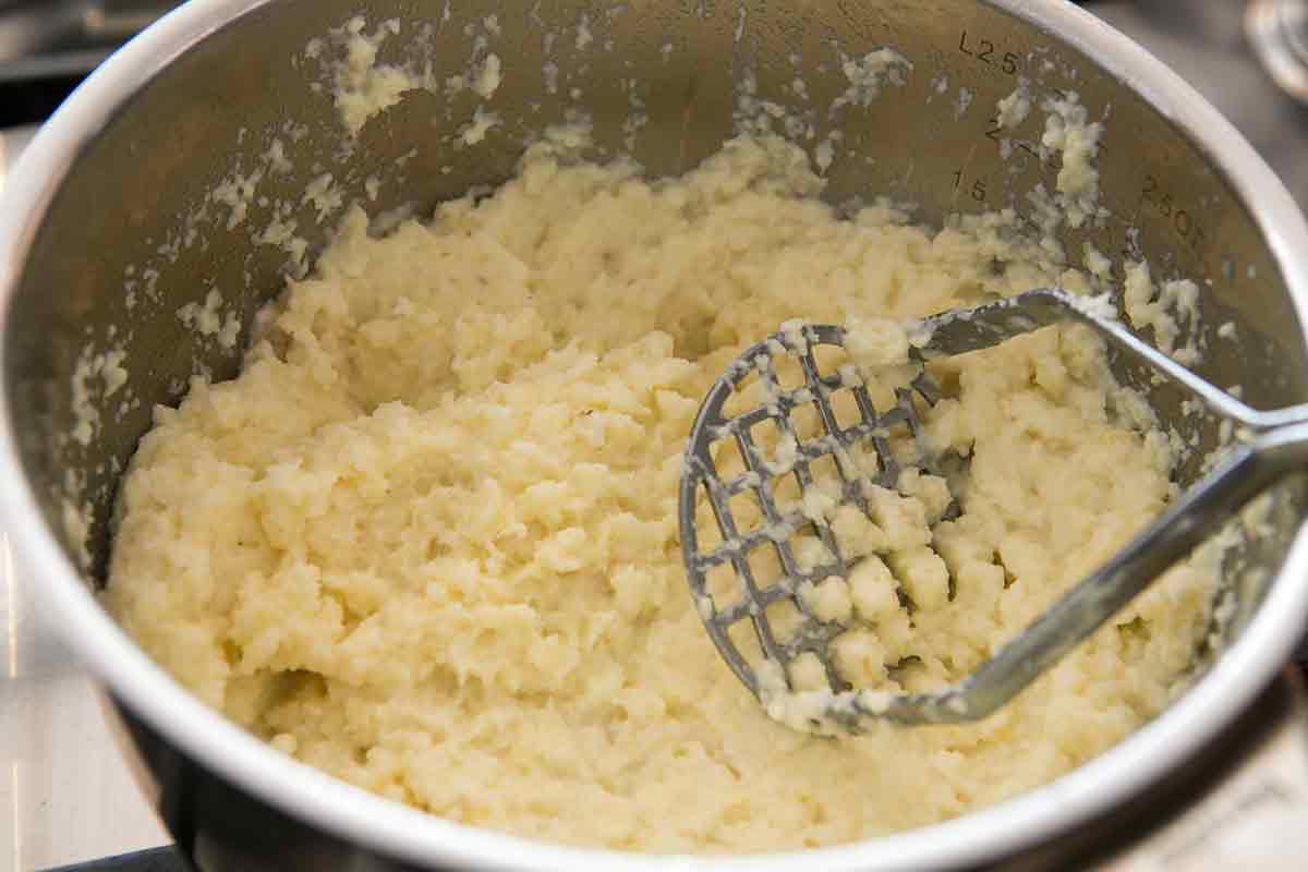 Add the milk or cream, butter, a generous pinch of salt, and mash: