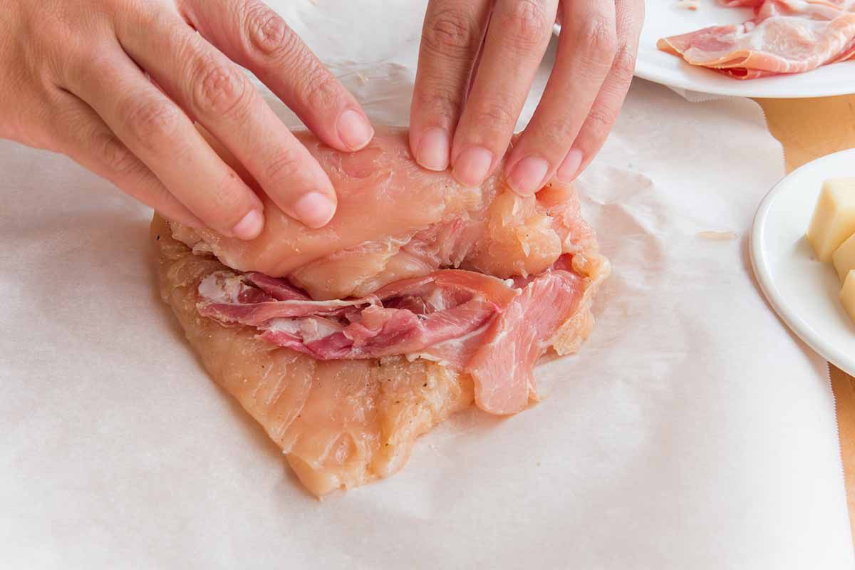 It’s important for the chicken breast to be thin enough to cook in the allotted time, without being so thin that it’s easily torn when stuffed or rolled.