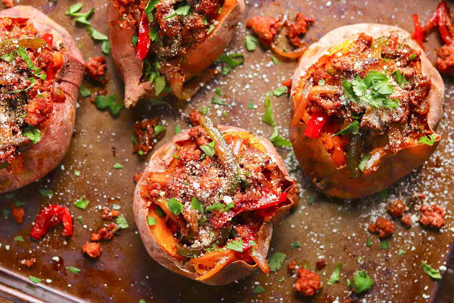 With this recipe, whole sweet potatoes get baked and then stuffed with a chorizo mixture for an update on the classic bacon-and-cheese stuffed baked potato, if you will.