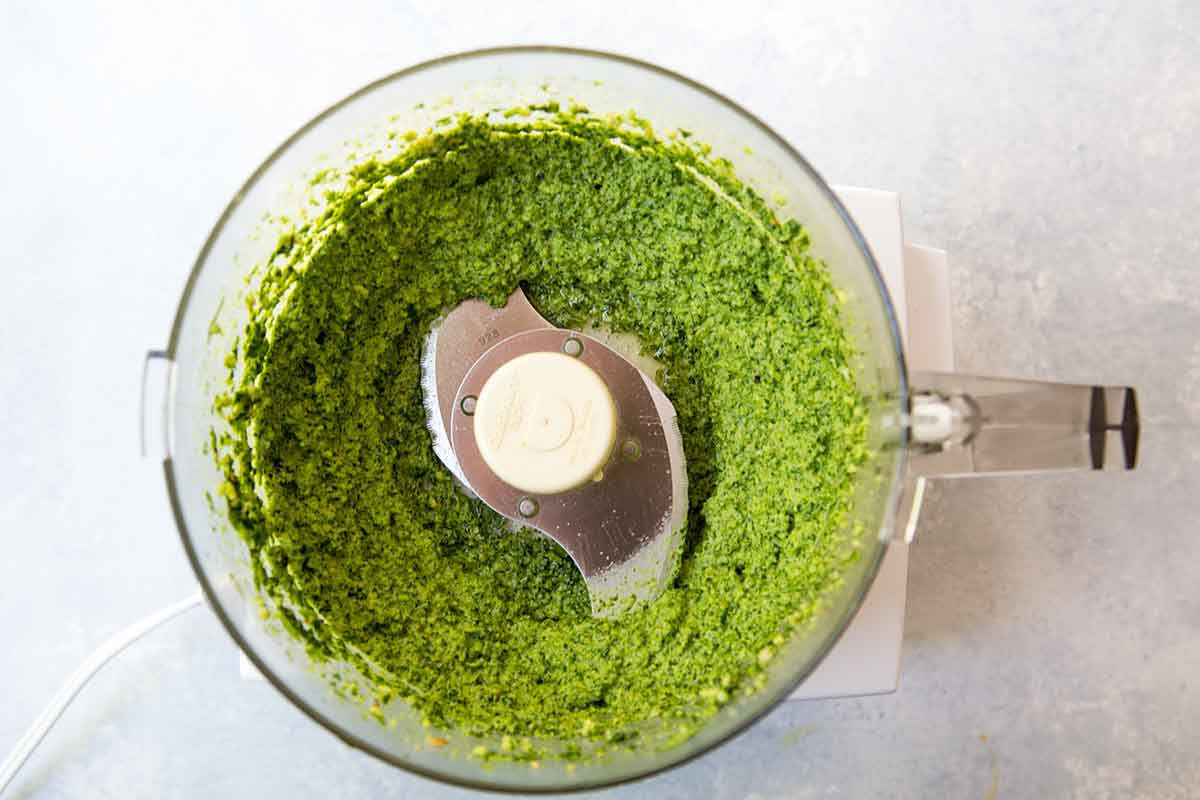 Unlike basil pesto, this pesto requires no Parmesan or garlic. The complementary flavors are red onion and serrano chile instead.