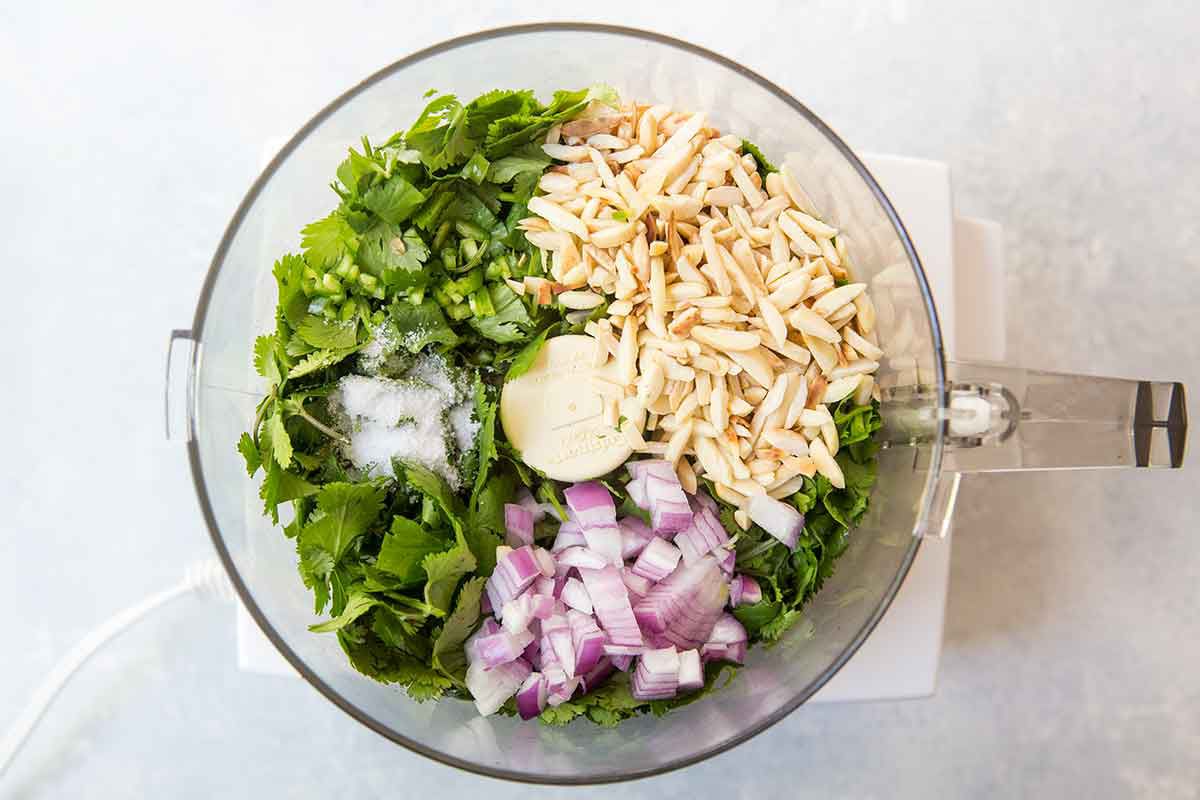 Pulse the cilantro, almonds, onion, chile, and salt: