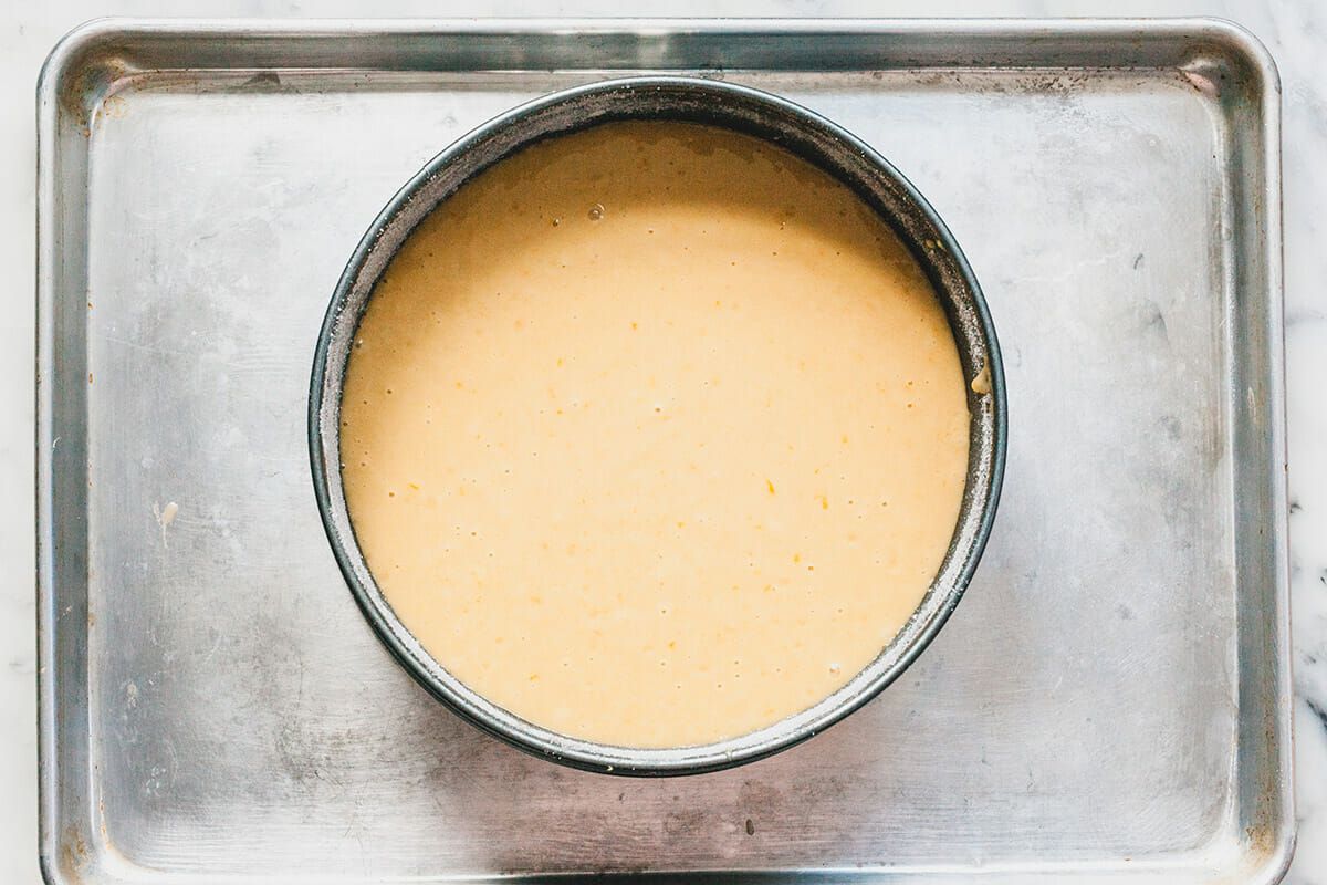 Set the cake pan on a baking sheet and pour the batter into the pan.