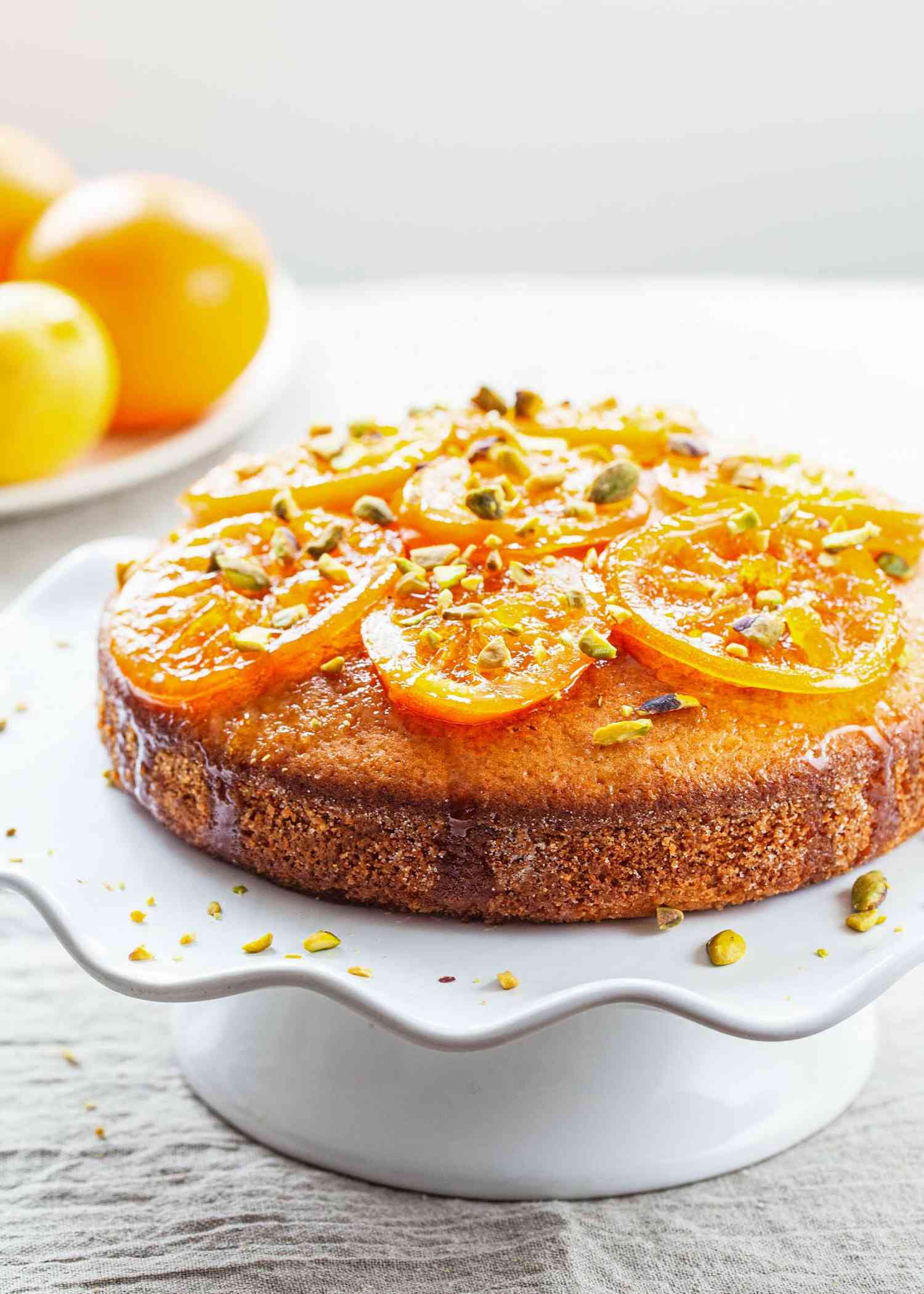 To finish the cake, you can simply sprinkle it with confectioner’s sugar (especially if you'll be having it for breakfast) or if you want to get a little fancy and make an impression, decorate the top with candied orange slices and pistachios.