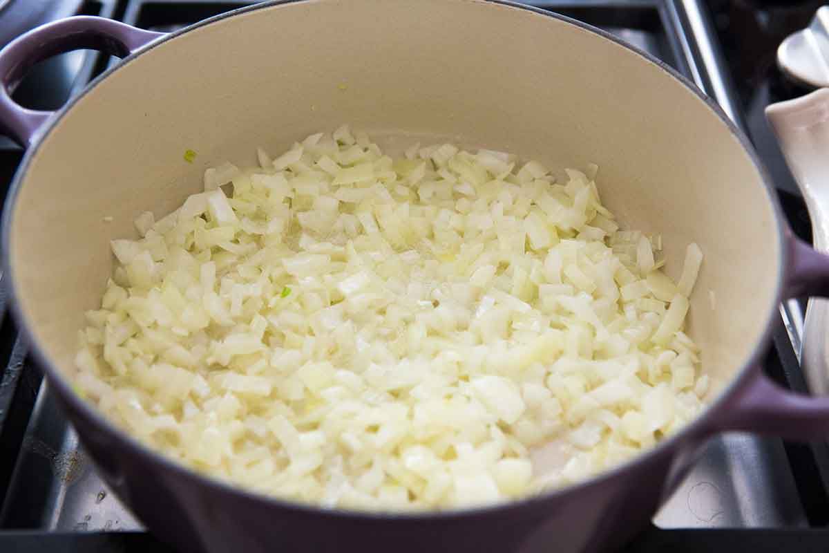 Melt the butter in a 4 to 5 quart pot on medium heat. Add the onions and cook until translucent, about 5 minutes.