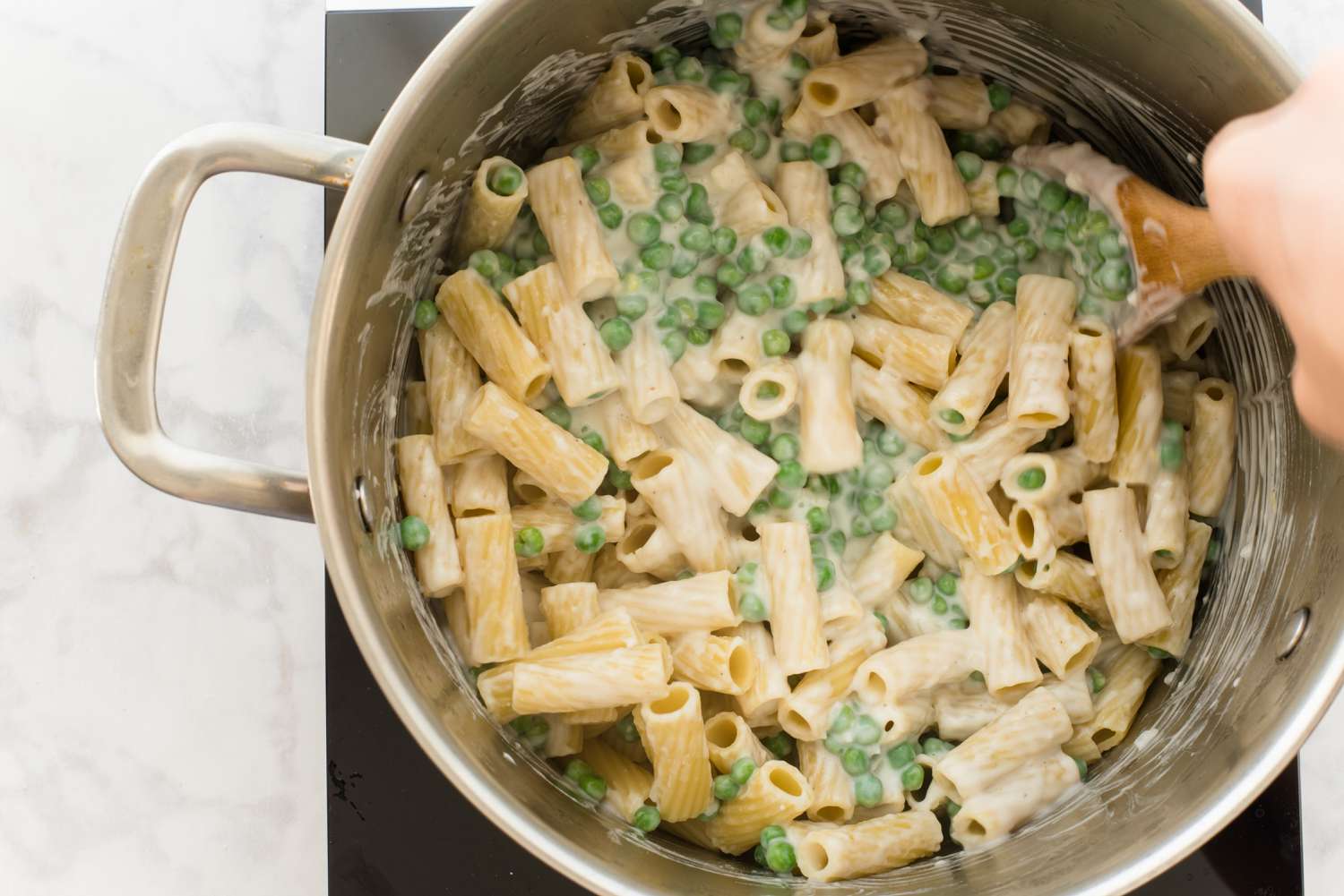 Fold the pasta into the pot with the béchamel sauce and the peas. Make sure it's coated completely.