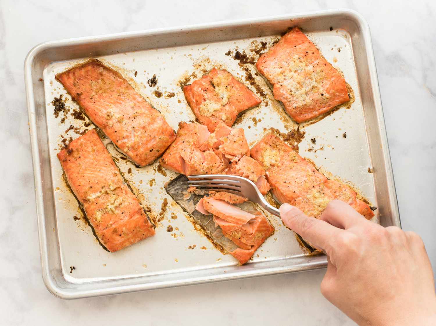 Once your salmon has finished broiling, remove it from the oven and carefully flake the flesh into walnut-sized pieces. Discard the skin.
