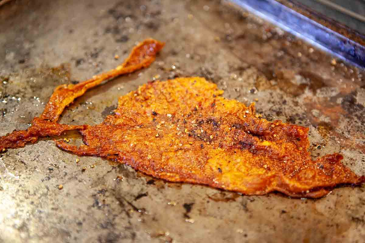 Just take leftover skin from your Thanksgiving turkey, place it fat-side down on a baking sheet, sprinkle with salt and pepper, and bake until crispy. Oo la la, this is good!
