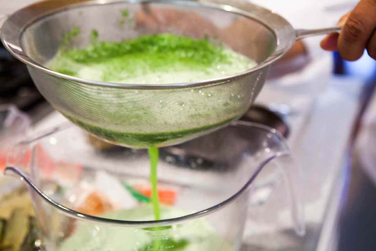 Place a fine mesh sieve over a bowl and pour the purée through it, pressing against the sieve with a rubber spatula or the back of a spoon to extract as much liquid out as possible.