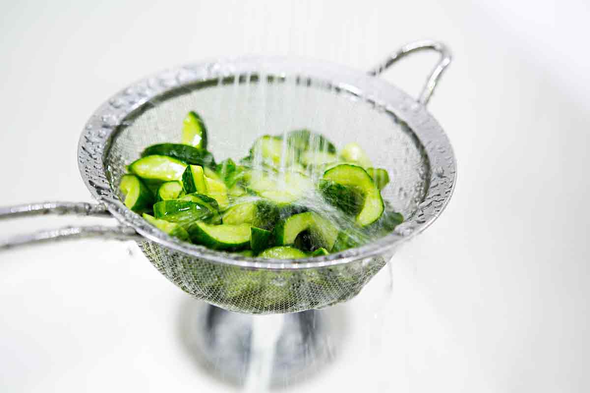 Elise Bauer Then rinse off the salt, drain the cucumbers, and squeeze out more excess moisture with paper towels.