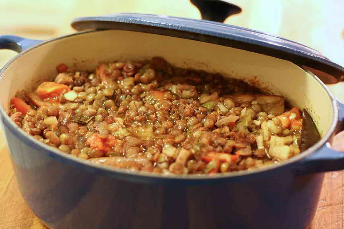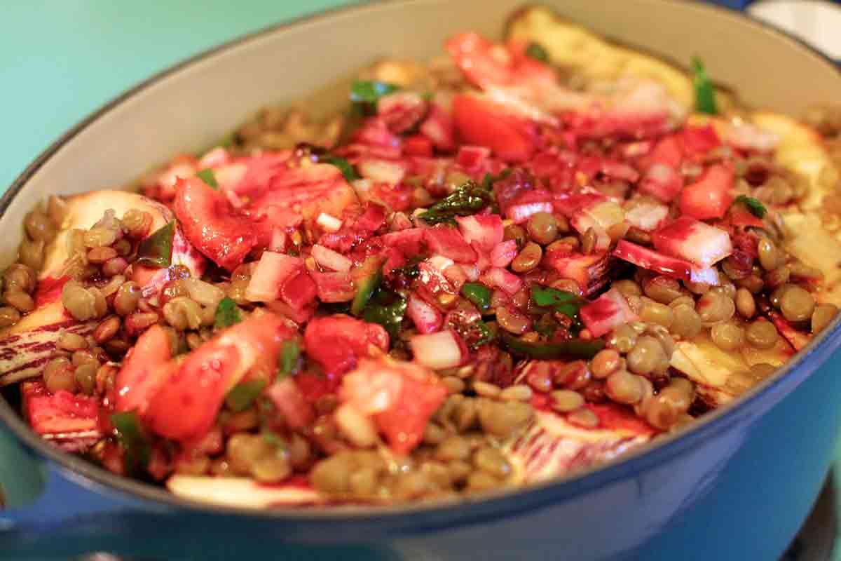 Rinse the eggplant and pat dry. Spread 1/2 cup of the vegetable mixture in the Dutch oven and top with half of the eggplant. Cover with half of the lentils and half of the remaining vegetable mixture. Top with the remaining eggplant, lentils and vegetables. Pour the remaining olive oil around the side and over the vegetables, then drizzle with the pomegranate molasses.