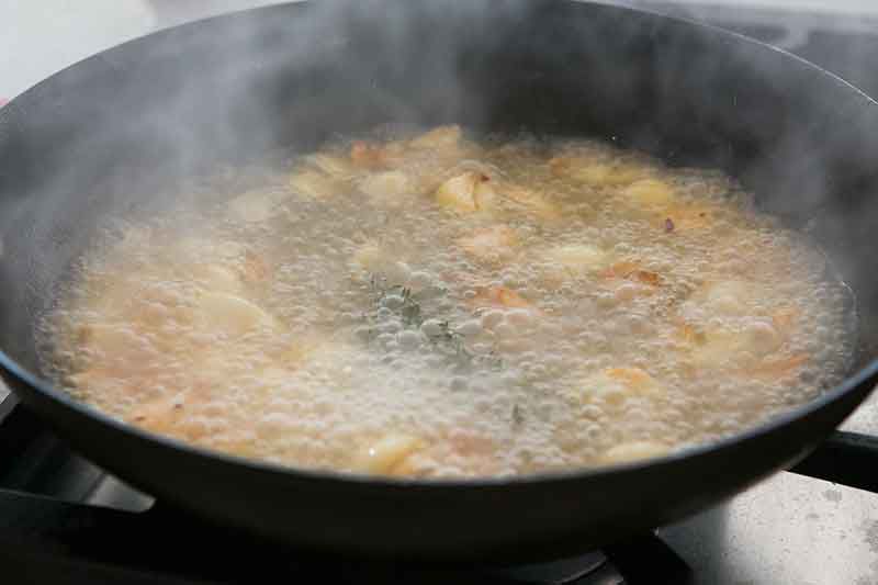 Add the wine and the sprigs of thyme. Bring to a boil. Add the chicken pieces, skin-side-up. Reduce the heat to medium low.
