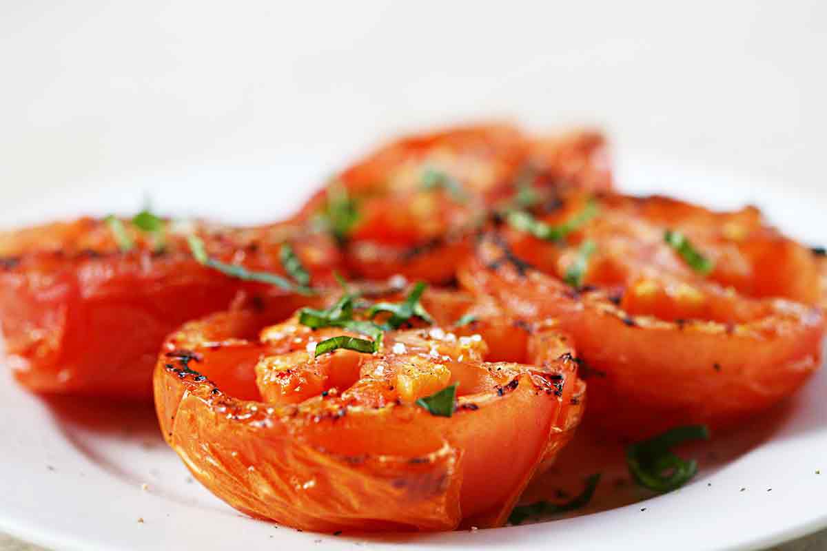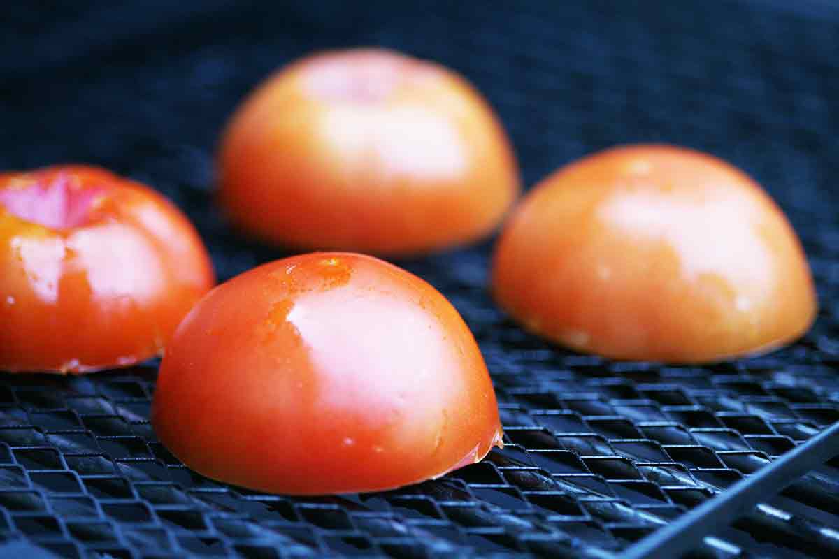 Place the tomatoes, cut side down, on the grill surface. Cover the grill and let cook for about 4 minutes. (Check after 2 minutes.)