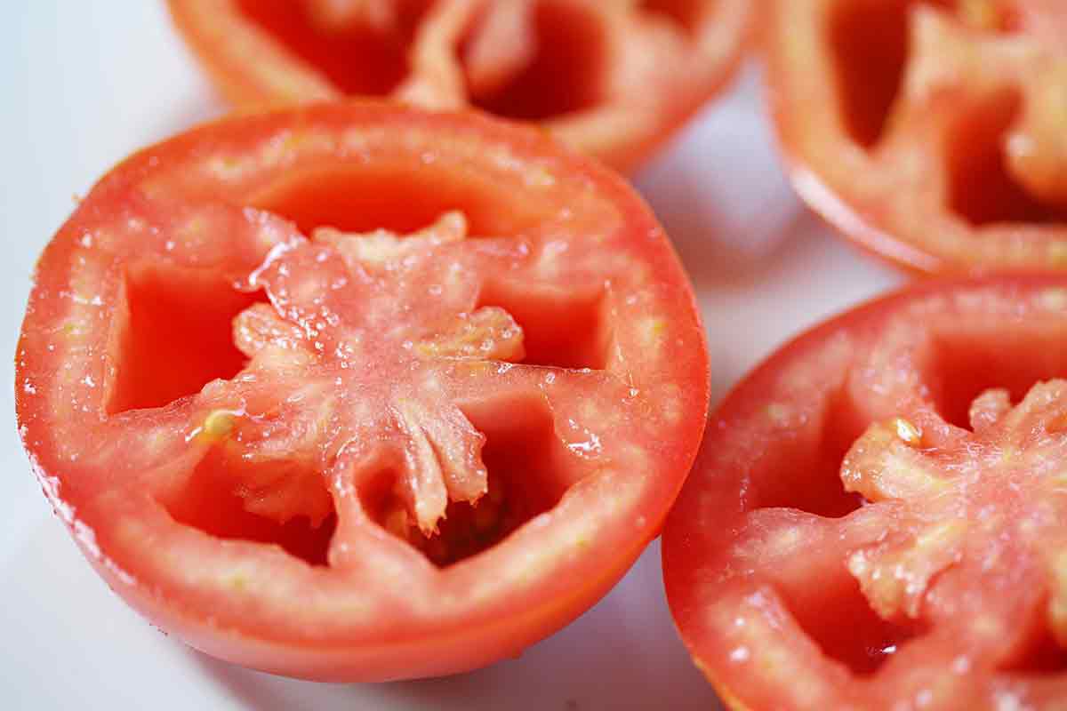 Standing over a sink, use your fingers to gently dislodge and remove the watery pulp and seeds. (Although the seeds and pulp contain a lot of flavor, when you grill the tomatoes they are going to be lost anyway.)