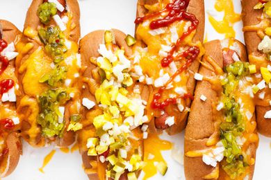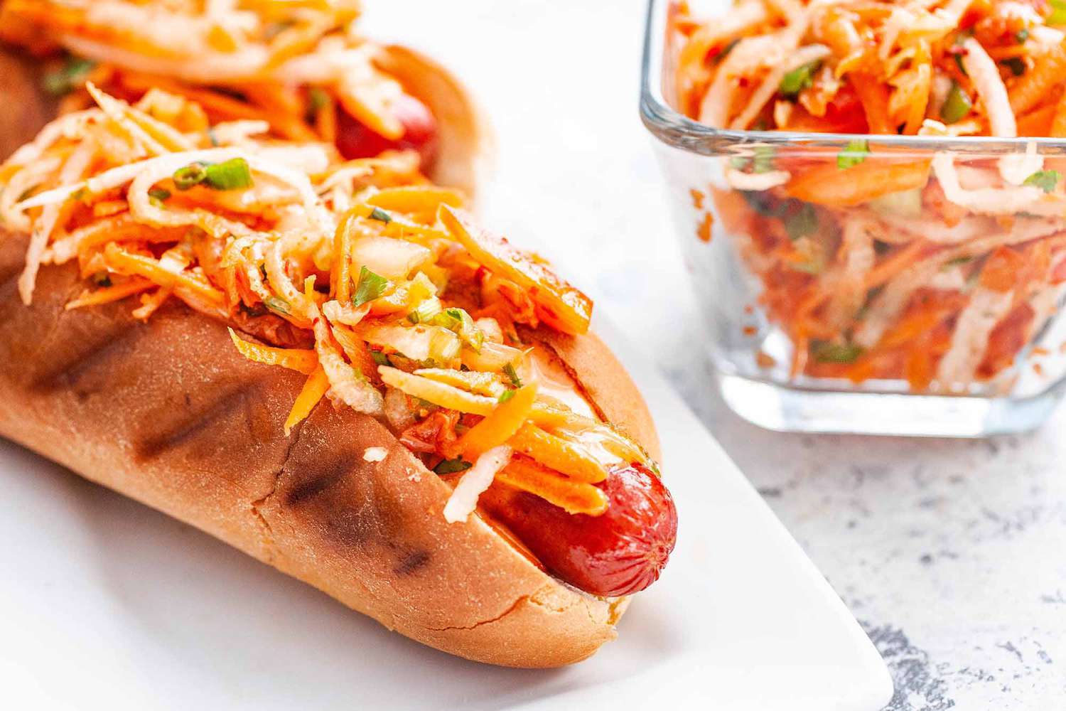 These Korean-style hot dogs are your basic grilled beef hot dog in a bun, but with a really special (and simple) spicy kimchi slaw and creamy sauce. The slaw features daikon radish, carrot, and kimchi -- a mix that will taste familiar if you’ve eaten a lot of Korean food like bibimbap!
