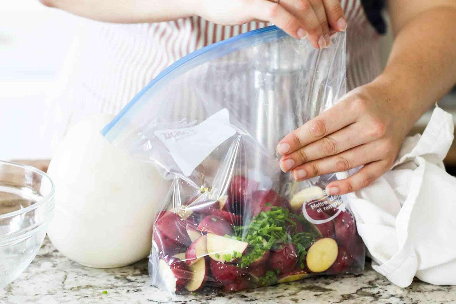 Seal the bag with as little air as possible by using water-displacement method to help press out all the air: Just slowly lower the bag with the potatoes into the water, letting the pressure of the water press the air through the top of the bag. Once the top of the bag reaches the water line and all the air has been pressed out, seal the bag. (Read more here.)