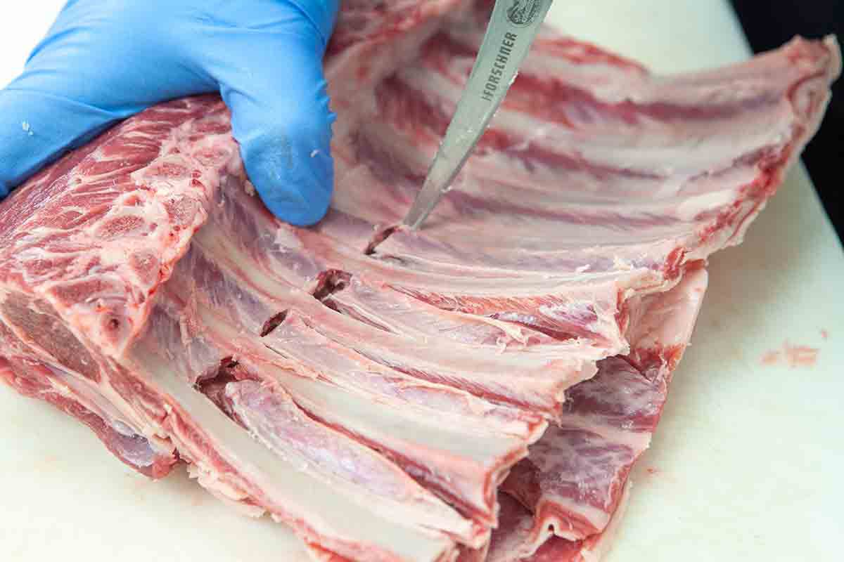 Turn the rib rack over, so that it is now bone side up. You should be able to see the markings made from the knife that got inserted from the other side. Those markings will delineate the boundary beyond which you will not cut.