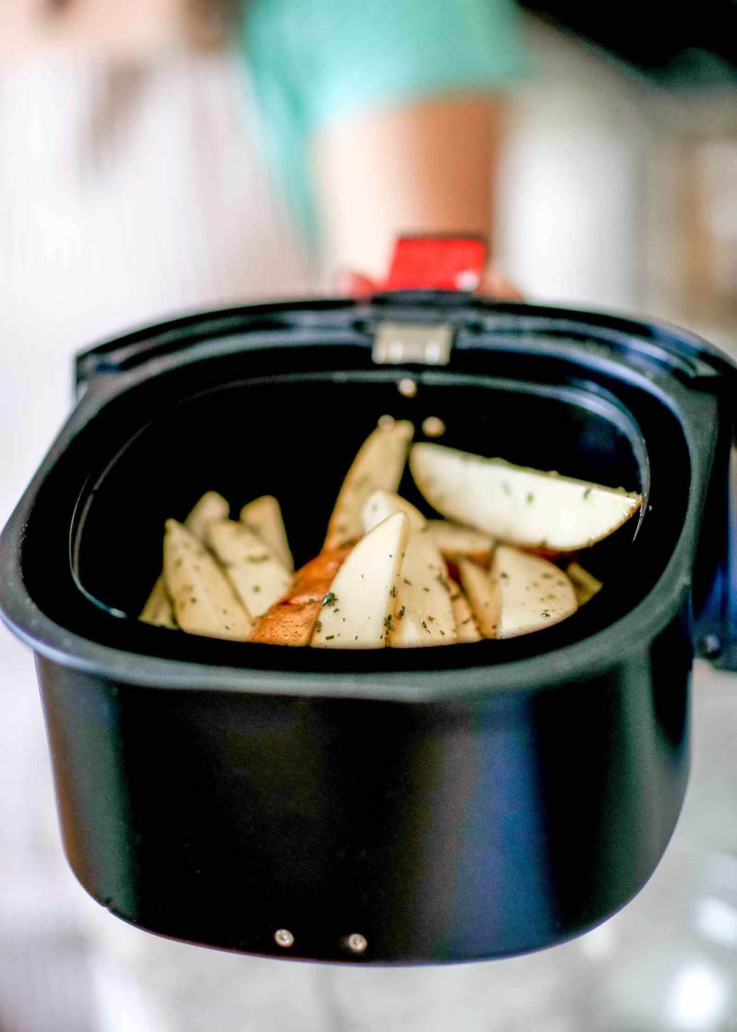 Slide the basket out, toss the potatoes to redistribute them—you may notice some spots look more air fried than others.