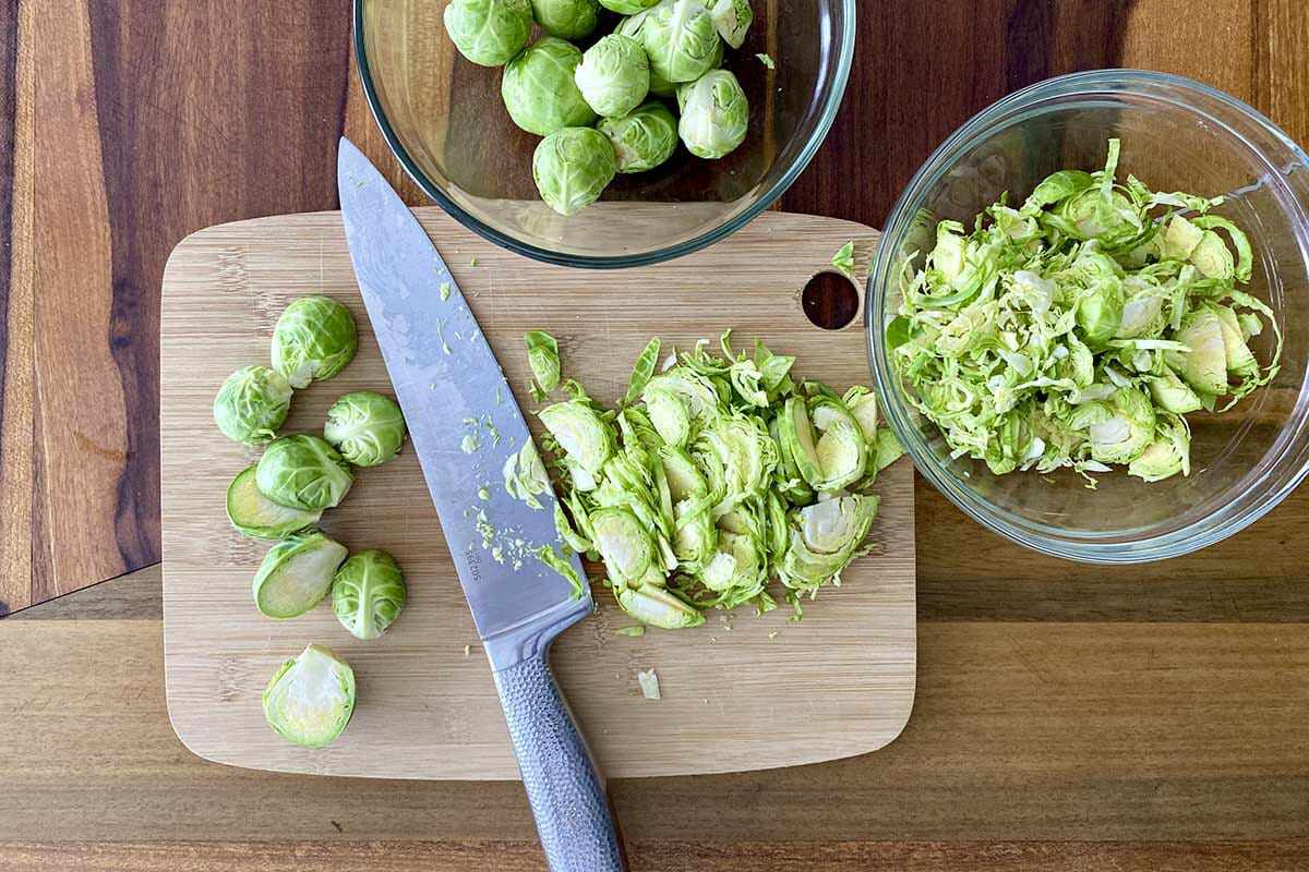 While you could use a food processor to shred your Brussels sprouts and kale, a sharp knife works just as well and leaves fewer dishes to wash!
