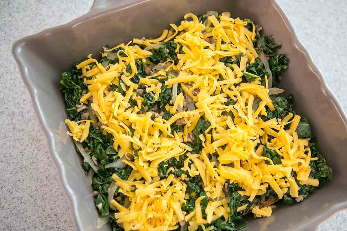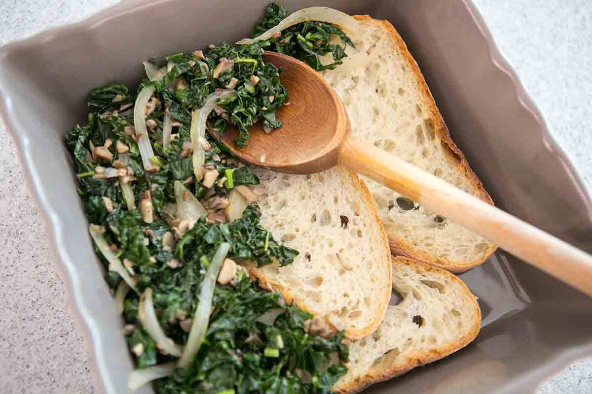Layer casserole dish with bread, kale mushroom mix, cheese: