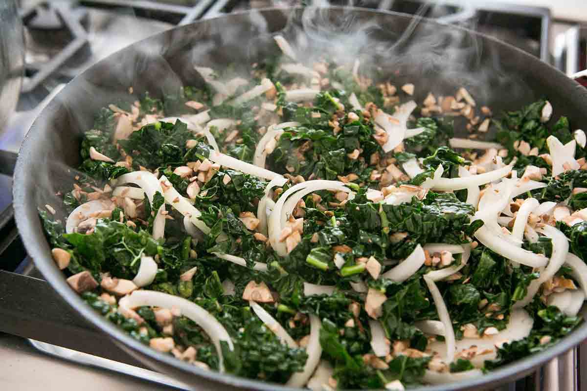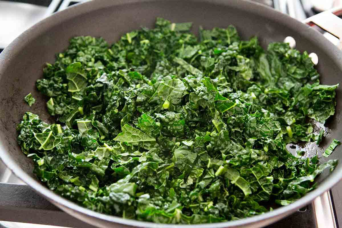 Heat the olive oil in a large skillet on medium heat. Add the thinly sliced kale and cook until just wilted, about 2 to 3 minutes.