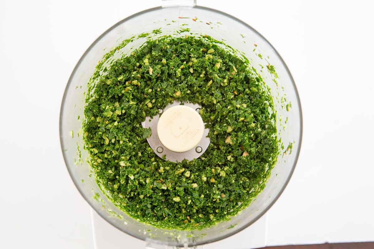 Kale can have its own strong taste, so to balance it we're adding some lemon zest and lemon juice to the pesto, along with toasted almonds, garlic, Parmesan, and extra virgin olive oil.