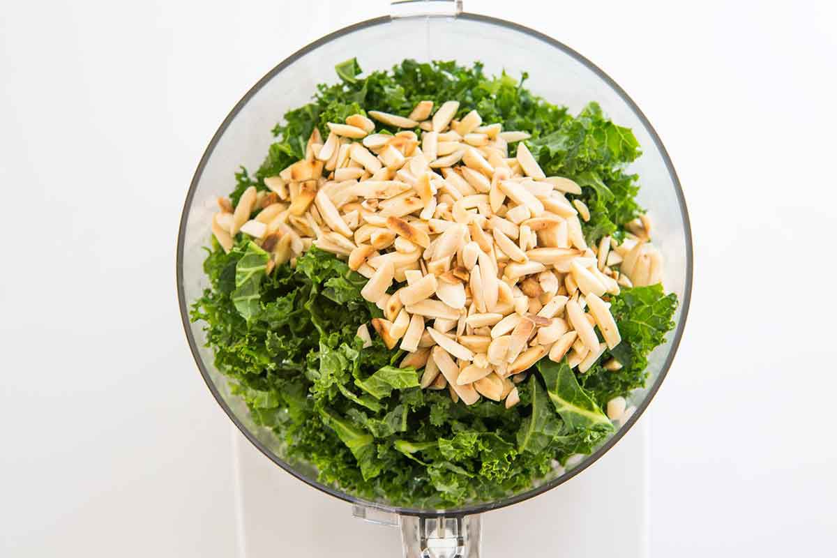 Place the chopped fresh kale and toasted almonds in a food processor and pulse several seconds.