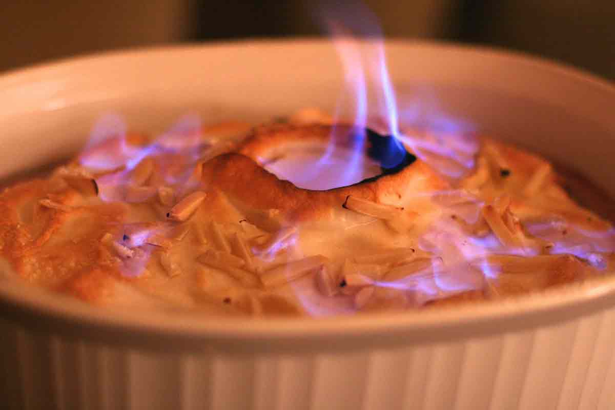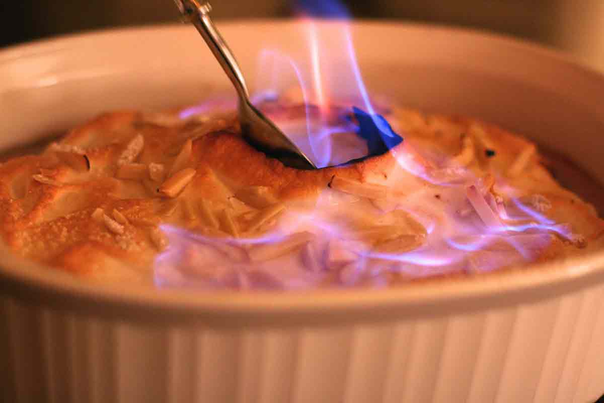 Elise Bauer Bring flaming to the table, spooning the liqueur over the top to caramelize the sugar, until the flames go out.