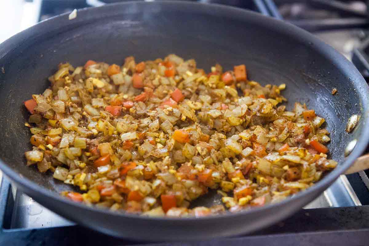 Cook the onions, bell pepper, garlic, ginger, spices: