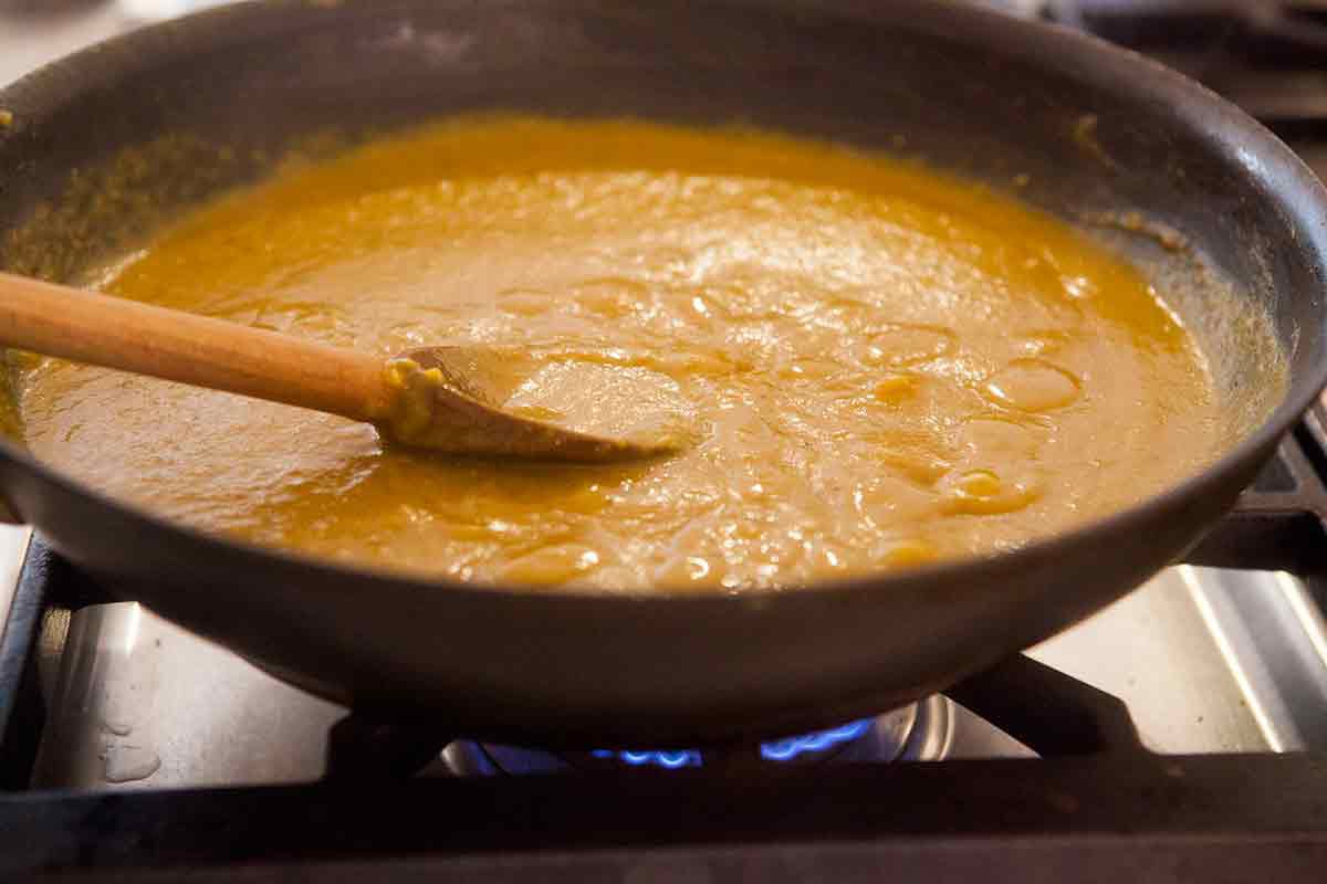 Elise Bauer Add the curry powder and cumin, cook for a few more minutes. The spices will absorb some of the oil, so if anything begins to stick too much to the bottom of the pan, add a little more oil to the pan.