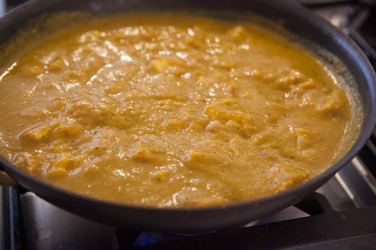 Our mango chicken curry uses fresh mangoes, full-fat coconut milk for richness, ginger, curry powder, cumin, and vinegar to offset the sweetness of the mango. Make the sauce first, and then add boneless chicken pieces and simmer until just cooked through.