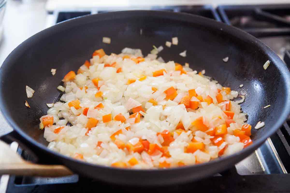 Heat oil in a large sauté pan over medium heat. Add onions and bell pepper and cook, stirring occasionally, until soft, about 5 minutes.